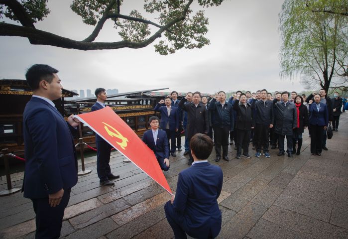 面向黨旗,莊嚴宣誓。在革命紅船啟航地南湖,陳肇雄帶領(lǐng)參加活動的全體黨員同志,面向黨旗,舉起右手,重溫莊嚴的入黨誓詞,讓熱血在紅色圣地再次沸騰。